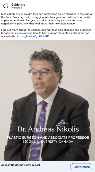 Example: Galderma is leveraging LinkedIn to raise awareness of medication-driven weight loss effects on facial skin. They drive through to a website where clinicians can read insights from a 1,300-patient survey and learn more about the approach for this new type of patient.
