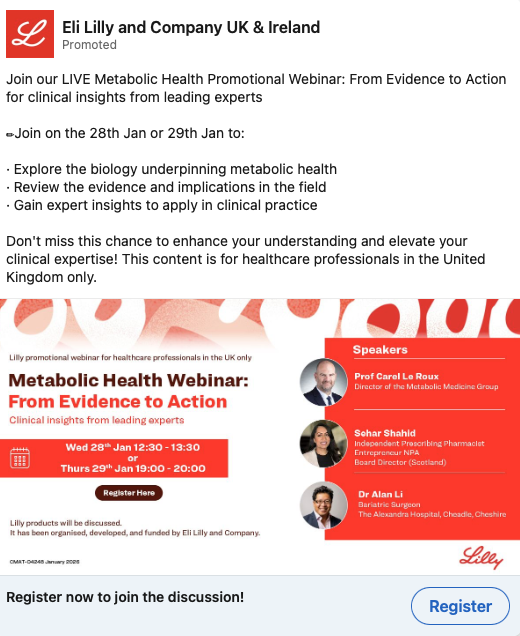 Example: This example illustrates how LinkedIn can be utilised to promote medical education initiatives using eye-catching creative. It appeals to time-poor HCPs by offering educational content they can access quickly.